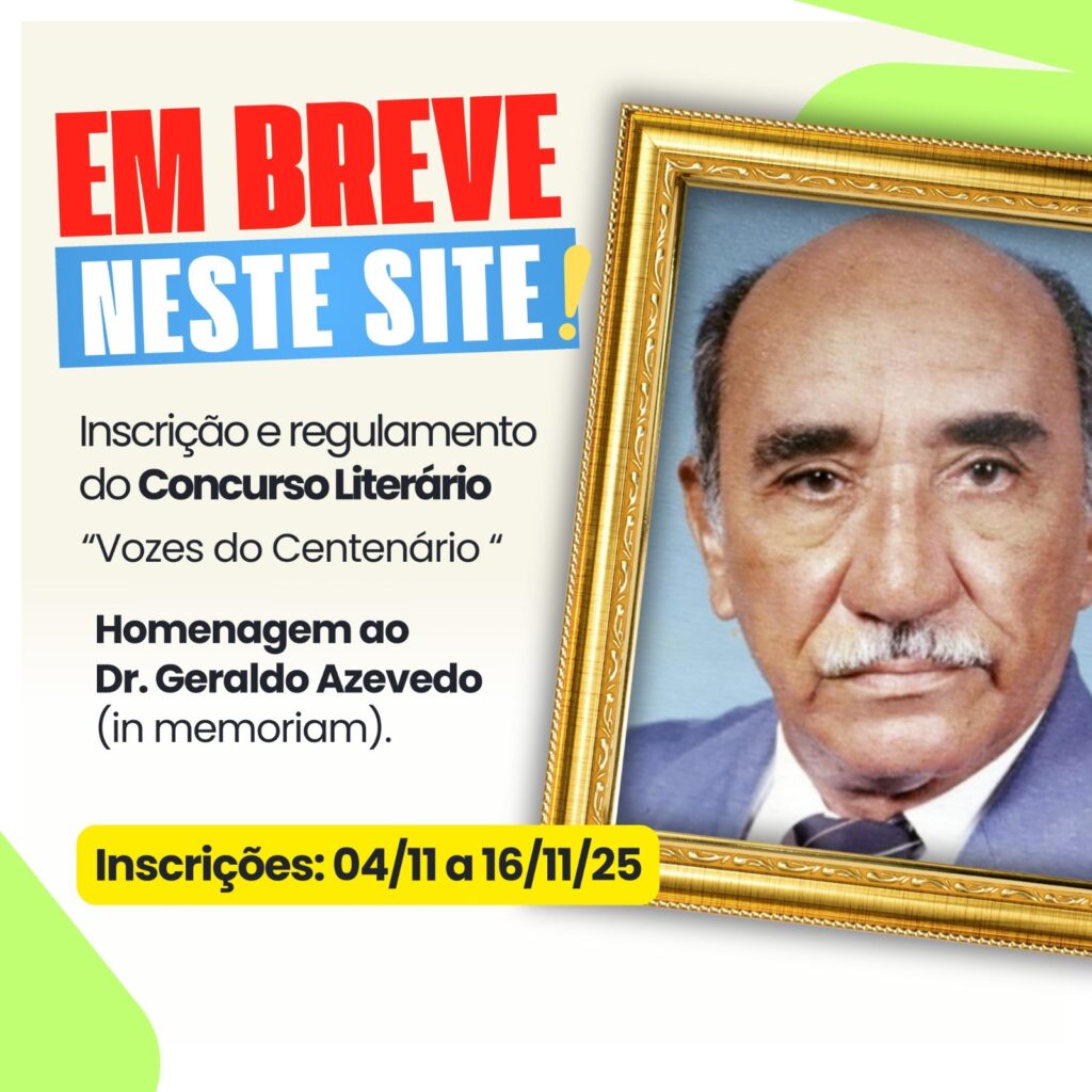EM BREVE NESTE SITE !Inscrição e regulamento do Concurso Literário “Vozes do Centenário “. Homenagem ao Dr. Geraldo Azevedo (in memoriam).Inscrições: 04/11 a 16/11/25